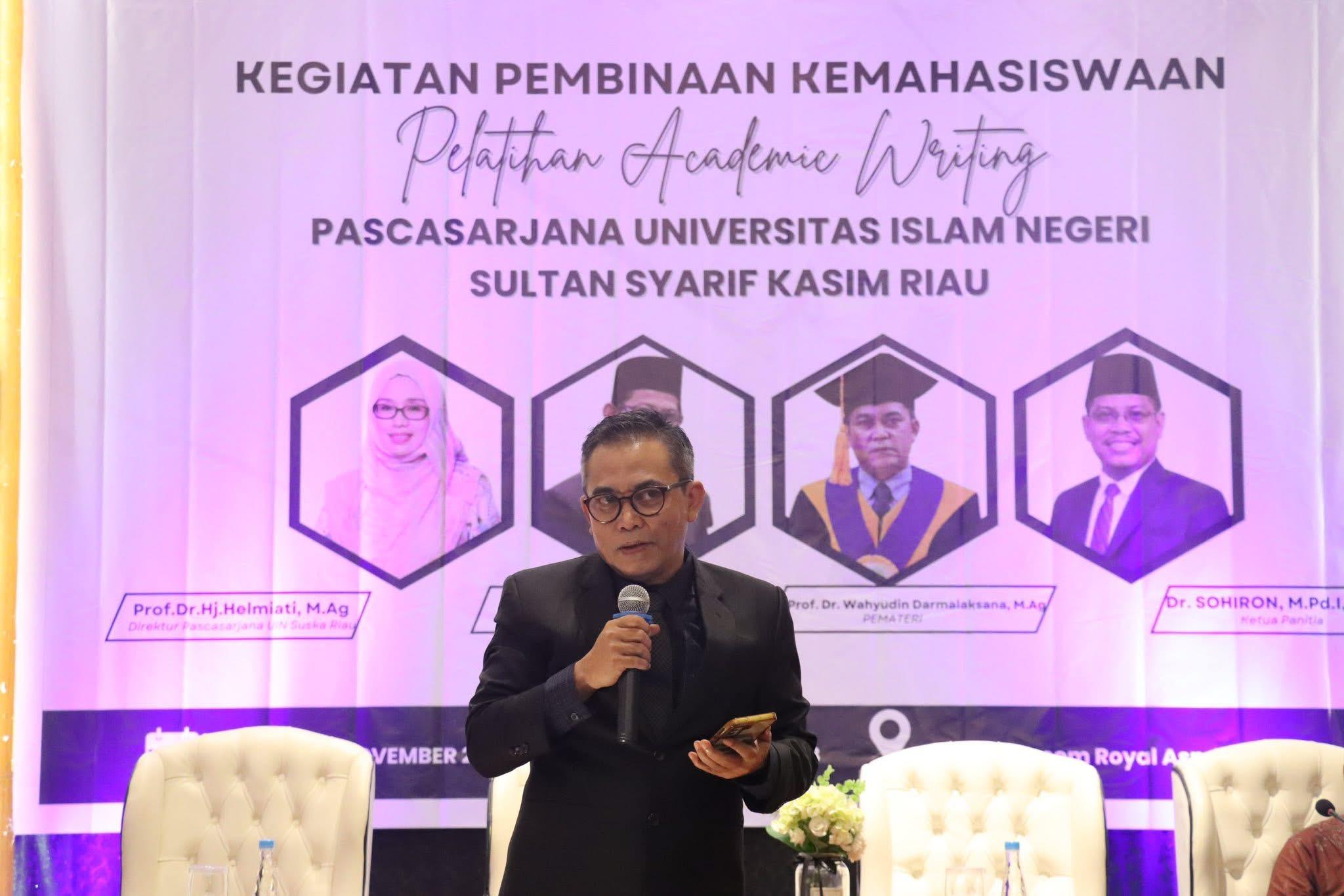 Pascasarjana UIN Suska Riau kembali menghadirkan kegiatan strategis dalam rangka peningkatan kualitas akademik melalui Pelatihan Academic Writing bagi mahasiswa. Kegiatan yang berlangsung pada Selasa, 18 November 2025 ini menghadirkan narasumber nasional, Prof. Dr. Wahyudin Darmalaksana, M.Ag, seorang trainer berpengalaman dan pakar dalam bidang penulisan akademik.